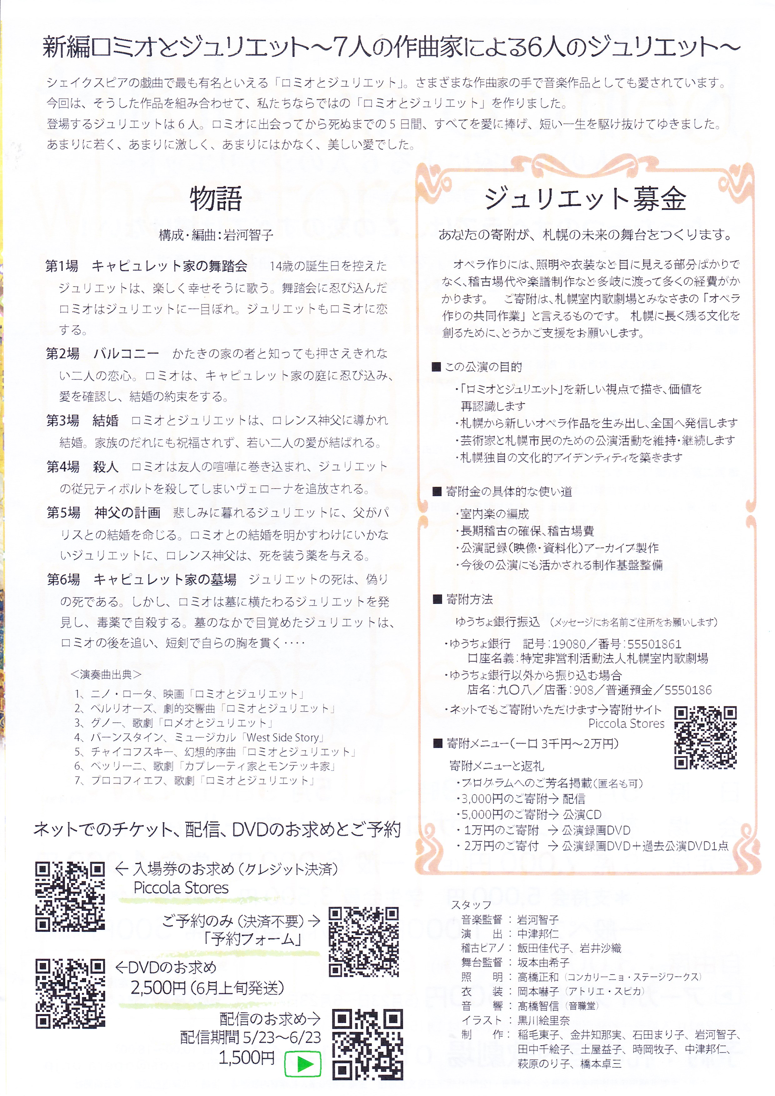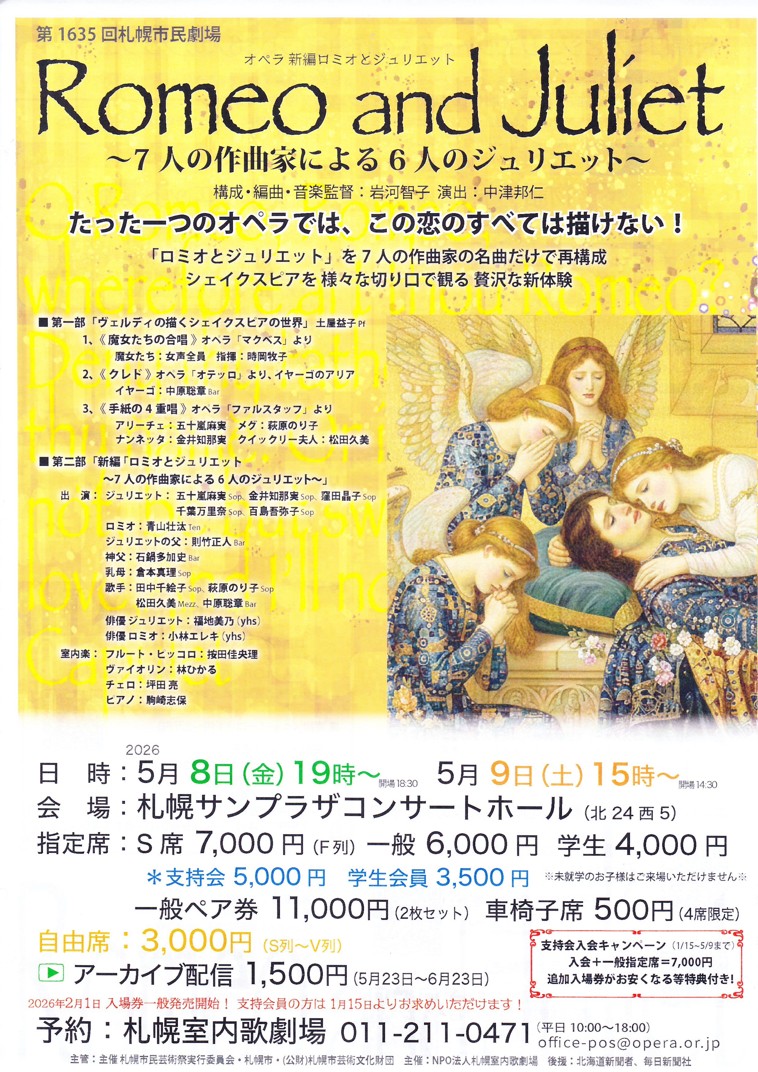 第1635回札幌市民劇場 オペラ新編ロミオとジュリエット Romeo and Juliet ~7人の作曲家による6人のジュリエット~ 構成・編曲・音楽監督:岩河智子 演出:中津邦仁 たった一つのオペラでは、この恋のすべては描けない! 「ロミオとジュリエット」を7人の作曲家の名曲だけで再構成 シェイクスピアを様々な切り口で観る贅沢な新体験 ・日時:5月8日(金) 19時~ 開場18:30 5月9日(土) 15時~ 開場14:30 ・会場:札幌サンプラザコンサートホール (北24西5) ・指定席:S席 7,000円(F列) 一般 6,000円 学生 4,000円 *支持会 5,000円 学生会員 3,500円 ※未就学のお子様はご来場いただけません。 一般ペア券 11,000円(2枚セット) 車椅子席 500円(4席限定) ・自由席:3,000円(S列~V列) ・予約:2026年2月1日入場券発売開始! 支持会員の方は1月15日よりお求めいただけます! 札幌室内歌劇場 011-211-0471 (平日10:00~18:00)、office-pos@opera.or.jp ・主管:主催札幌市民芸術祭実行委員会・札幌市・(公財) 札幌市民芸術文化財団 ・主催:NPO法人札幌室内歌劇場 ・後援:北海道新聞社、毎日新聞社 ・アーカイブ配信:1,500円 (5月23日 ~6月23日) ・支持会入会キャンペーン:1/15~5/9まで 入会+一般指定席=7,000円 追加入場券がお安くなる等特典付き! 【プログラム】 ■第一部 「ヴェルディの描くシェイクスピアの世界」土屋益子pf 1、《魔女たちの合唱》オペラ「マクベス」より 魔女たち:女声全員 指揮:時岡牧子 2、《クレド》オペラ「オテッロ」より、イヤーゴのアリア イヤーゴ:中原聡章Bar 3、《手紙の4重唱》オペラ「ファルテタッフ」より アリーチェ:五十嵐麻実 メグ:萩原のり子 ナンネッタ:金井知那実 クイックリー夫人:松田久美 ■第二部 新編「ロミオとジュリエット」 ~7人の作曲家による6人のジュリエット~ 出演:ジュリエット:五十嵐麻実Sop 金井知那実Sop 窪田晶子Sop 千葉万里奈Sop 百島吾弥子So ロミオ:青山壮太Ten ジュリエットの父:則竹正人Bar 神父:石鍋多加史Bar 乳母:倉本真理Sop 歌手:田中千絵子Sop 萩原のり子Sop 松田久美Mezz 中原聡章Bar 俳優ジュリエット:福地美乃(yhs) 俳優ロミオ:小林エレキ(yhs) 室内楽:フルート・ピッコロ:按田佳央理 ヴァイオリン:林ひかる チェロ:坪田 亮 ピアノ:駒崎志保 スタッフ:音楽監督:岩河智子 演出:中津邦仁 稽古ピアノ:飯田佳代子、岩井沙織 舞台監督:坂本由紀子 照明:高橋正和(コンカリ―ニョ・ステージワークス) 衣装:岡本赫子(アトリエ・スピカ) 音響:高橋智信(音職堂) イラスト:黒川絵里奈 制作:稲毛東子、金井知那実、石田まり子、岩河智子、田中千絵子、 土屋益子、時岡牧子、中津邦仁、萩原のり子、橋本卓三 【新編ロミオとジュリエット】 ~7人の作曲家による6人のジュリエット~ シェイクスピアの戯曲で最も有名といえる「ロミオとジュリエット」。さまざまな作曲家の手で音楽作品としても愛されています。 今回は、そうした作品を組み合わせて、私たちならではの「ロミオとジュリエット」を作りました。登場するジュリエットは6人。ロミオに出会ってから死ぬまでの5日間、すべてを愛に捧げ、短い一生を駆け抜けてゆきました。 あまりに若く、あまりに激しく、あまりにはかなく、美しい愛でした。 【物語】 構成・編曲:岩河智子 第1場 キャピュレット家の舞踏会 14歳の誕生日を控えたジュリエットは、幸せそうに歌う。 舞踏会に忍び込んだロミオはジュリエットに一目ぼれ。ジュリエットもロミオに恋をする。 第2場 バルコニー かたきの家の者と知っても押えきれない二人の恋心。ロミオはキャピュレット家の庭に忍び込み、愛を確認し、結婚の約束をする。 第3場 結婚 ロミオとジュリエットは、ロレンス神父に導かれ結婚。家族のだれにも祝福されず、若い二人の愛が結ばれる。 第4場 殺人 ロミオは友人の喧嘩に巻き込まれ、ジュリエットの従兄ティボルトを殺してしまいヴェローナを追放される。 第5場 神父の計画 悲しみに暮れるジュリエットに、父がパリスとの結婚を命じる。ロミオとの結婚を明かすわけにはいかないジュリエットに、ロレンス神父は、死を装う薬を与える。 第6場 キャピュレット家の墓場 ジュリエットの死は、偽りの死である。しかし、ロミオは墓に横たわるジュリエットを発見し、毒薬で自殺する。墓の中で目覚めたジュリエットは、 ロミオの後を追い、短剣で自らの胸を貫く・・・ 《演奏曲出典》 1、ニノ・ロータ、映画「ロミオとジュリエット」 2、ベルリオーズ、劇的交響曲「ロミオとジュリエット」 3、グノー、歌劇「ロメオとジュリエット」 4、バーンスタイン、ミュージカル「West Side Story」 5、チャイコフスキー、幻想的序曲「ロミオとジュリエット」 6、ベッリーニ、歌劇「カプレーティ家とモンテッキ家」 7、プロコイエフ、歌劇「ロミオとジュリエット」