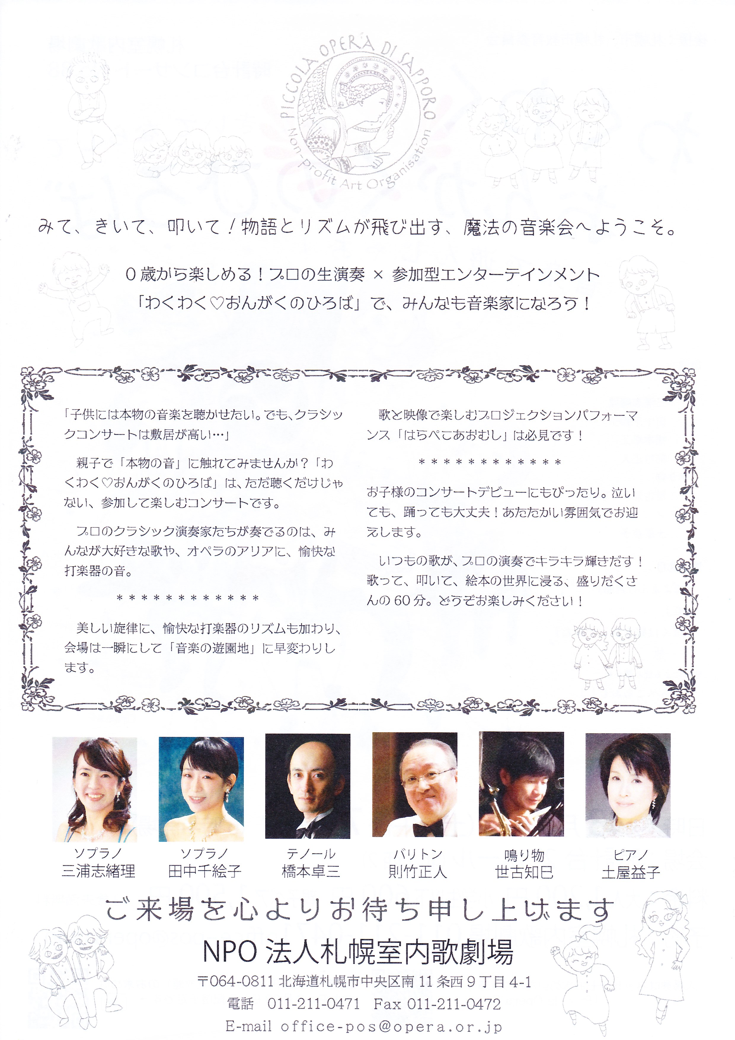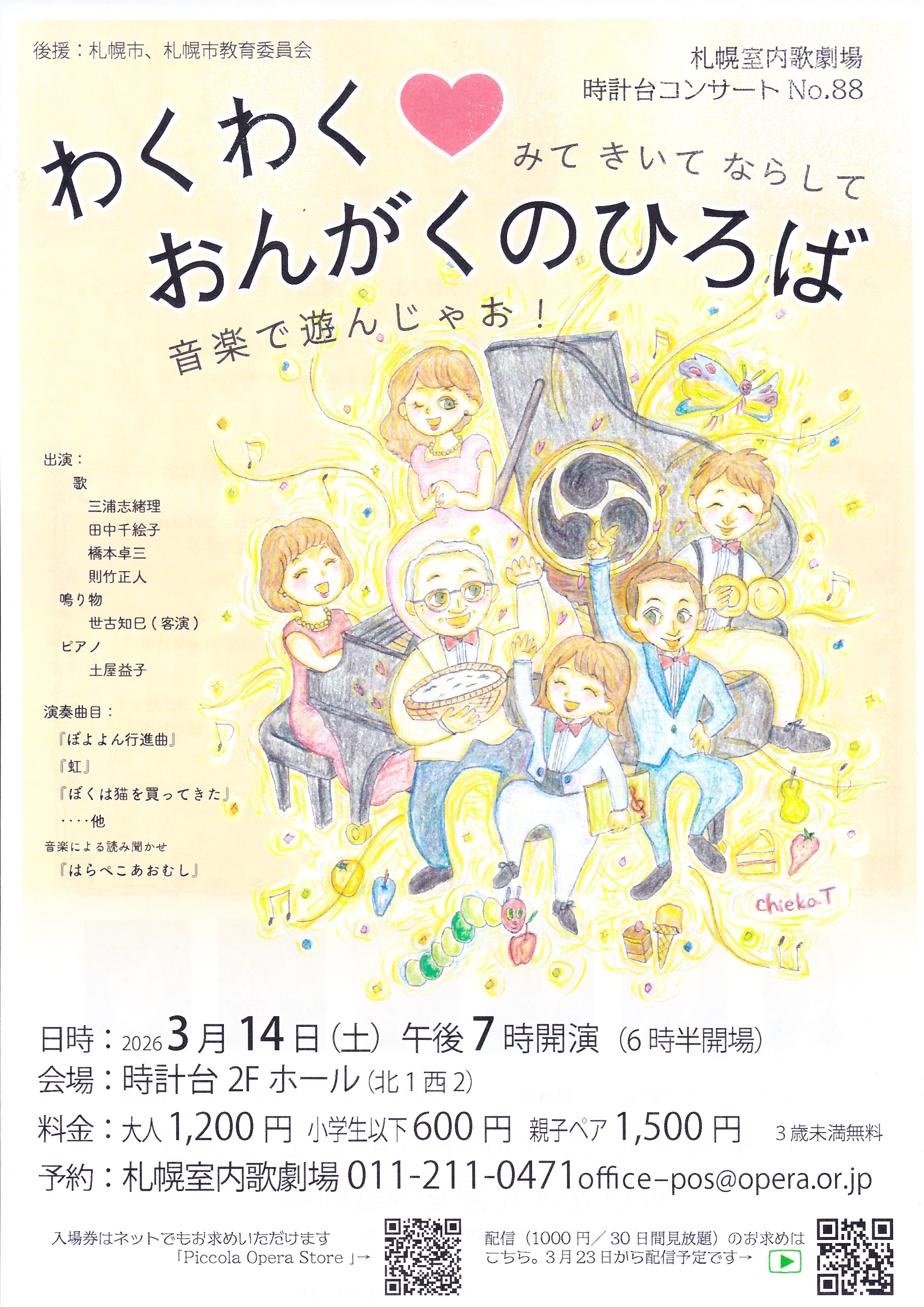 札幌室内歌劇場 時計台コンサートVol.88 「わくわくおんがくのひろば」 みて きいて ならして 音楽であそんじゃお! ・日時:3月14日(土) 午後7時開演 (6時半開場) ・会場:時計台2Fホール (北1西2) ・指定席:大人 1,200円 小学生以下 600円 親子ペア 1,500円 *3歳未満無料 ・予約:札幌室内歌劇場 011-211-0471 (平日10:00~18:00)、 office-pos@opera.or.jp ・後援:札幌市・札幌市教育委員会 ・主催:NPO法人札幌室内歌劇場 〒064-0811 札幌市中央区南11条西9丁目4-1 電話 011-211-0471 Fax 011-211-0472 E-mail office-pos@opera.or.jp 【出演】 歌:三浦志緒理 田中千絵子 橋本卓三 則竹正人 鳴り物: 世古知巳(客演) ピアノ: 土屋益子 【曲目】 「ぼよよん行進曲」 「虹」 「ぼくは猫を買ってきた」 ・・・他 音楽による読み聞かせ 「はらぺこあおむし」 みて きいて 叩いて! 物語とリズムが飛び出す、魔法の音楽会へようこそ。 0歳から楽しめる! プロの生演奏×参加型エンターテインメント 「わくわく♡おんがくのひろば」で、みんなも音楽家になろう! ・「子供には本物の音楽を聴かせたい。でも、クラシックコンサートは敷居い・・・」 ・親子で「本物の音楽」に触れてみませんか? 「わくわく♡おんがくのひろば」は ただ聴くだけじゃない、参加して楽しむコンサートです。 ・プロのクラシック音楽家たちが奏でるのは、みんな大好きな歌や、オペラのアリア に、愉快な打楽器の音。 *************************************************** ・美しい旋律に、愉快な打楽器のリズムも加わり、会場は一瞬にして「音楽の遊園 地」に早変わりします。 ・歌と映像で楽しむプロジェクションパフォーマンス「はらぺこあおむし」は必見で す! *************************************************** ・お子様のコンサートデビューにもぴったり。泣いても、踊っても大丈夫!あたたかい 雰囲気でお迎えします。 ・いつもの歌が、プロの演奏でキラキラ輝きだす! 歌って、叩いて、絵本の世界に浸 る、盛りだくさんの60分。どうぞお楽しみください!!
